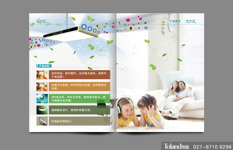 解決方案:民潔康是一家開發(fā)生產(chǎn)空氣凈化器的企業(yè),圖藍廣告設計運用產(chǎn)品出風扇頁流動風的特點,作為設計靈感的來源,顏色搭配柔和、清新,給人感覺舒爽、健康;內(nèi)頁延續(xù)了清新風格,利用產(chǎn)品的特點制作的效果圖,激發(fā)觀者想要擁有這款產(chǎn)品,享受這愜意的時刻。